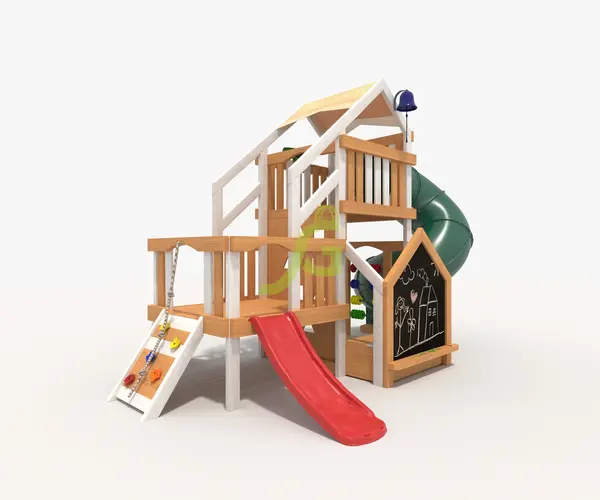 Игровая площадка А4 - это компактный игровой комплекс для детей от 3 до 12 лет. Она отлично подходит для небольших участков, предлагая разнообразные активности на ограниченном пространстве. В состав площадки входит деревянная башня с песочницей внизу, пластиковая горка длиной 2,2 метра, а также качельная балка с двумя подвесными качелями. На одной из сторон башни расположен скалодром с цветными зацепами, который развивает ловкость и координацию. С другой стороны находится веревочная лестница, дополняющая игровой процесс. Площадка изготовлена из клееного бруса сосны, устойчивого к деформациям. Все деревянные элементы обработаны антисептической пропиткой, которая защищает древесину от влаги, грибка и насекомых, продлевая срок службы конструкции. Для сборки используется оцинкованный крепеж, который не ржавеет. Конструкция соответствует требованиям безопасности ГОСТ. Мы доставляем площадки по всей России. До терминала транспортной компании в вашем городе доставка бесплатна. Сборка площадки займет 1-2 дня, если вы решите сделать это самостоятельно. Также вы можете заказать услугу профессиональной сборки у наших мастеров.