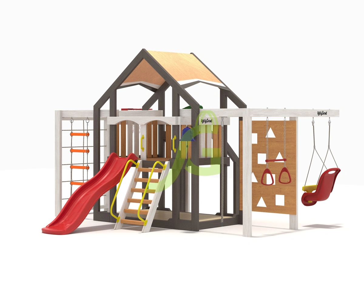 Детская игровая площадка А9 - это компактное решение для активного досуга на свежем воздухе. Она подойдет детям от 3 до 10 лет, предлагая разнообразные игровые элементы на небольшой площади. Эта модель станет отличным выбором для тех, кто ищет функциональную площадку без лишних деталей. Конструкция площадки включает в себя башню с деревянной крышей, которая защитит от солнца и небольшого дождя. С башни ведет волнообразная пластиковая горка длиной 2,2 метра, обеспечивающая веселое скольжение. Под башней есть пространство для песочницы, где малыши смогут строить замки и играть с песком. В комплекте также идут качели со спинкой, для самых маленьких, и качели-шины, которые можно использовать как маятниковые или просто для раскачивания. Для развития ловкости и координации предусмотрен скалодром с цветными зацепами, а также веревочная лестница. Площадка изготовлена из клееного бруса, который отличается прочностью и устойчивостью к деформациям. Все деревянные элементы обработаны антисептической пропиткой, защищающей от влаги, грибка и насекомых, что продлевает срок службы конструкции. Крепежные элементы оцинкованы, что предотвращает коррозию. Площадка соответствует требованиям ГОСТ Р 52169-2012, что подтверждает ее безопасность и надежность при эксплуатации. Доставка площадки осуществляется по всей России, до терминала транспортной компании в вашем городе бесплатно. Сборка не требует специальных навыков и занимает 1-2 дня, если вы решите собрать ее самостоятельно. При необходимости вы можете воспользоваться услугами наших профессиональных сборщиков, которые быстро и качественно установят площадку на вашем участке.
