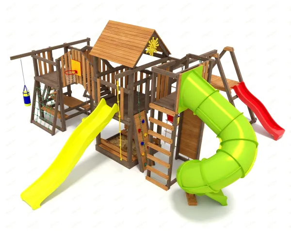 Деревянная крыша, веревочная лестница, канат с тремя узлами, веревочная сетка для лазания. Кубельковые качели и лодочка, волновая горка 3 м, скалодром с канатом и песочница. Вес 200 кг.
