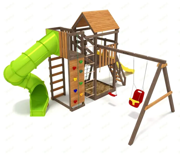 Деревянная крыша, веревочная лестница, канат с тремя узлами, веревочная сетка для лазания. Кубельковые качели и лодочка, волновая горка 3 м, скалодром с канатом и песочница. Вес 200 кг.