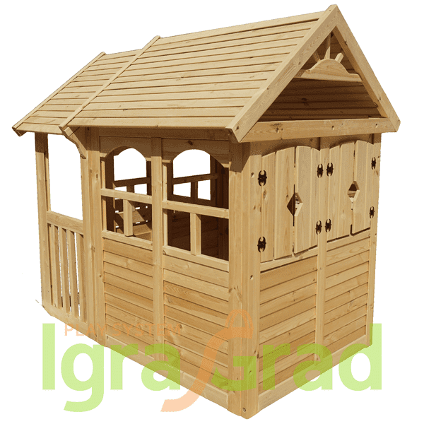 Детский деревянный домик - деревянная детская площадка для детей 3-12 лет. Размеры 1,28 м x 2,08 м x 2,04 м м. Качественный клееный брус, надежные крепления, иллюстрированная инструкция по сборке.