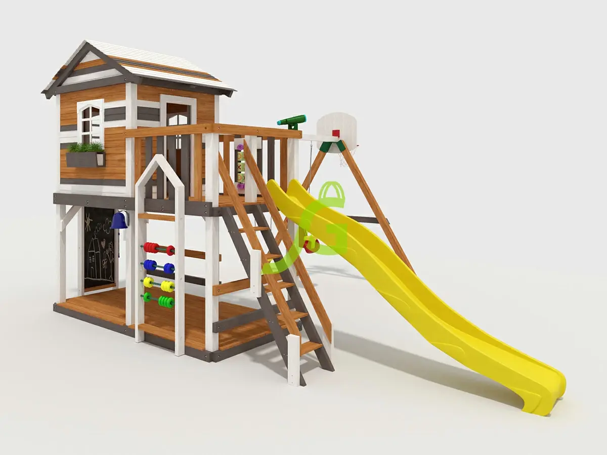 Детская площадка Домик 1 мод.1 - это комплекс для детей от 3 лет, который сочетает игровую башню с разнообразными активностями. Ее главная фишка - это двухуровневый домик с балконом, где ребенок сможет играть в сюжетные игры. Площадка включает двухъярусную башню с деревянной крышей, пластиковыми окошками и кашпо. Здесь есть волновая горка длиной 3 метра, деревянная лестница с перилами, качельный модуль с одиночными и кубельковыми качелями. Для активных игр предусмотрен баскетбольный щит, а для развития - доска "крестики-нолики", меловая доска, детские счеты. Дополняют комплекс бинокль и колокольчик для увлекательных приключений. Основа площадки - клееный брус сечением 100х100 мм, что обеспечивает прочность и долговечность конструкции. Деревянные элементы обработаны безопасной пропиткой, защищающей от влаги и вредителей. Все крепежи оцинкованы, что предотвращает коррозию. Площадка спроектирована с учетом требований безопасности и соответствует стандартам ГОСТ. Мы доставляем площадки по всей России, до терминала транспортной компании в вашем городе бесплатно. Вы можете собрать площадку самостоятельно за 1-2 дня, используя подробное руководство. Также доступна услуга профессиональной сборки нашими мастерами, чтобы вы могли быть уверены в правильной установке.