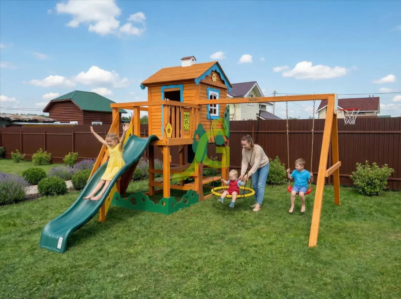Детская площадка "Домик 2 Совенок" - это полноценный игровой комплекс для детей от 3 до 12 лет. Главная особенность этой модели - двухуровневый домик с пластиковыми окошками, дверным проемом и декоративными элементами, которые создают атмосферу сказки и уюта. Конструкция площадки включает в себя множество активностей для всестороннего развития. Здесь есть волновая горка длиной 3 метра, качельный модуль с качелями "гнездо-паутинка" и пластиковыми качелями. Для любителей активных игр предусмотрен скалодром, баскетбольное кольцо и канат. Внутри домика можно найти стол и лавочки, а также доску для игры в крестики-нолики. Основание домика можно использовать для установки песочницы. Площадка изготовлена из клееного бруса 100х100 мм, который отличается прочностью и долговечностью. Все деревянные элементы обработаны специальным нетоксичным составом на водной основе, что обеспечивает защиту от внешних воздействий и продлевает срок службы. Крепежные элементы оцинкованы, что предотвращает коррозию. Конструкция соответствует требованиям ГОСТ и не имеет травмоопасных элементов. Доставка площадки осуществляется по всей России, до терминала транспортной компании в вашем городе бесплатно. Вы можете собрать площадку самостоятельно, следуя подробной инструкции - это займет 1-2 дня. Если вы предпочитаете доверить сборку профессионалам, наши мастера выполнят эту работу быстро и качественно.