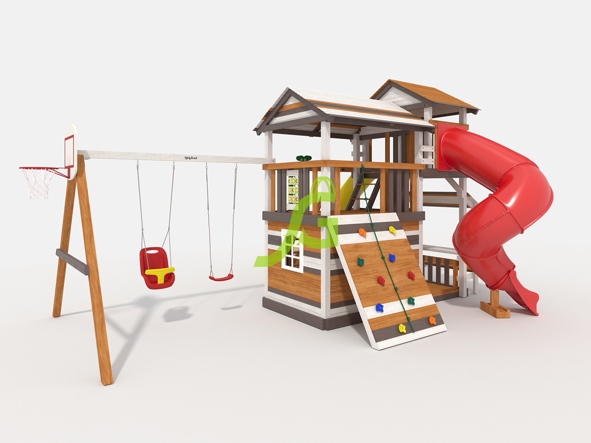 Детская площадка Домик 4 мод.1 - это масштабный игровой комплекс для детей от 3 до 12 лет. Она предлагает множество развлечений и станет центром притяжения на вашем участке. Главная особенность этой модели - двухуровневая башня с увеличенным домиком, где дети смогут придумывать свои игры и прятаться. Ваши дети найдут здесь все, что нужно для активного досуга. Площадка оборудована сразу двумя горками: волновой горкой длиной 4 метра и закрытой горкой-трубой, обе начинаются с высоты 2,1 метра. Также есть деревянная лестница с перилами, подъемный трап с канатом и скалодром, которые помогут развивать ловкость и координацию. Качельный модуль включает пластиковые одиночные и кубельковые качели. Для более спокойных игр предусмотрены игровой прилавок с навесом, доска "крестики-нолики", меловая доска, бинокль и колокольчик. Площадка изготовлена из клееного бруса сечением 100х100 мм, что гарантирует прочность и долговечность конструкции. Дерево обработано специальной пропиткой, которая защищает его от влаги и вредителей, при этом безопасна для детей. Все крепежные элементы оцинкованы, что предотвращает коррозию. Площадка соответствует стандартам безопасности и качества, чтобы вы были спокойны за своих детей. Мы доставляем площадки по всей России. Доставка до терминала транспортной компании в вашем городе бесплатна. Собрать площадку можно самостоятельно за 1-2 дня, воспользовавшись подробным руководством, или заказать услугу сборки у наших мастеров. Размеры площадки: длина 6,87 м, ширина 6,65 м, высота 3,80 м.