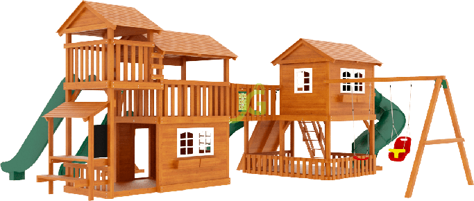 Детская площадка Домик 6 - это масштабный игровой комплекс для детей от 3 до 12 лет, который станет центром притяжения на вашем участке. Ее главная особенность - продуманное сочетание активных игр и мест для спокойного творчества, что позволит каждому ребенку найти занятие по душе. Площадка включает в себя двухуровневые домики с пластиковыми окошками и деревянными крышами. Для самых активных здесь есть четыре горки: две волновые длиной 3 метра с высоты 1,5 метра, одна волновая длиной 4 метра и одна горка-труба, обе с высоты 2,1 метра. Также предусмотрены скалодром, рукоход, канат, деревянная лестница с перилами и мостик. Качельный модуль оборудован одиночными и колыбельными качелями. Для творческих натур есть доска для рисования, игровой прилавок, игра "крестики-нолики" и деревянные кашпо для цветов. На первом этаже расположены заборчики и деревянные полы, что создает уютное пространство для игр. Конструкция площадки выполнена из клееного бруса сечением 100х100 мм, что обеспечивает высокую прочность и долговечность. Все деревянные элементы тщательно отшлифованы и обработаны безопасными пропитками, устойчивыми к внешним воздействиям и влаге. Это гарантирует отсутствие заноз и долгий срок службы комплекса, соответствующий требованиям ГОСТ. Оцинкованный крепеж защищен от коррозии, а пластиковые детали устойчивы к перепадам температур. Мы доставляем площадки по всей России. Доставка до терминала транспортной компании в вашем городе осуществляется бесплатно. Вы можете собрать комплекс самостоятельно, следуя подробной инструкции - это займет 1-2 дня. Если вы предпочитаете доверить сборку профессионалам, наши мастера выполнят ее качественно и быстро.