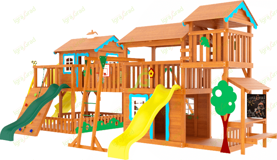 Детская площадка Домик 6 Совенок - это масштабный игровой комплекс для детей от 3 до 12 лет. Она предлагает множество вариантов для активного отдыха, развивая фантазию и физические навыки ребенка. Площадка состоит из двухуровневой конструкции с деревянной крышей и пластиковыми окошками. Здесь есть четыре горки: две волновые длиной 3 метра с платформы 1,5 метра и одна горка-труба с высоты 2,1 метра, а также одна горка-спуск. Для физического развития предусмотрены скалодром, рукоход, канат, деревянная лестница с перилами. Качельный модуль включает две гибкие качели на цепи. Для творческих занятий есть доска для рисования, игра "крестики-нолики" и игровой прилавок. Деревянный мостик, заборчики и полы на первом этаже дополняют игровую зону. Комплекс изготовлен из клееного бруса сечением 100х100 мм, что обеспечивает прочность и долговечность конструкции. Все деревянные элементы тщательно отшлифованы, обработаны безопасными пропитками, устойчивыми к влаге и внешним воздействиям. Крепеж оцинкован, что предотвращает коррозию. Площадка соответствует стандартам ГОСТ, гарантируя безопасность для детей. Мы доставляем площадки по всей России. Доставка до терминала транспортной компании в вашем городе бесплатна. Собрать комплекс можно самостоятельно за 1-2 дня, следуя подробной инструкции. Если вы предпочитаете профессиональную сборку, наши мастера выполнят эту работу, услуга оплачивается дополнительно.