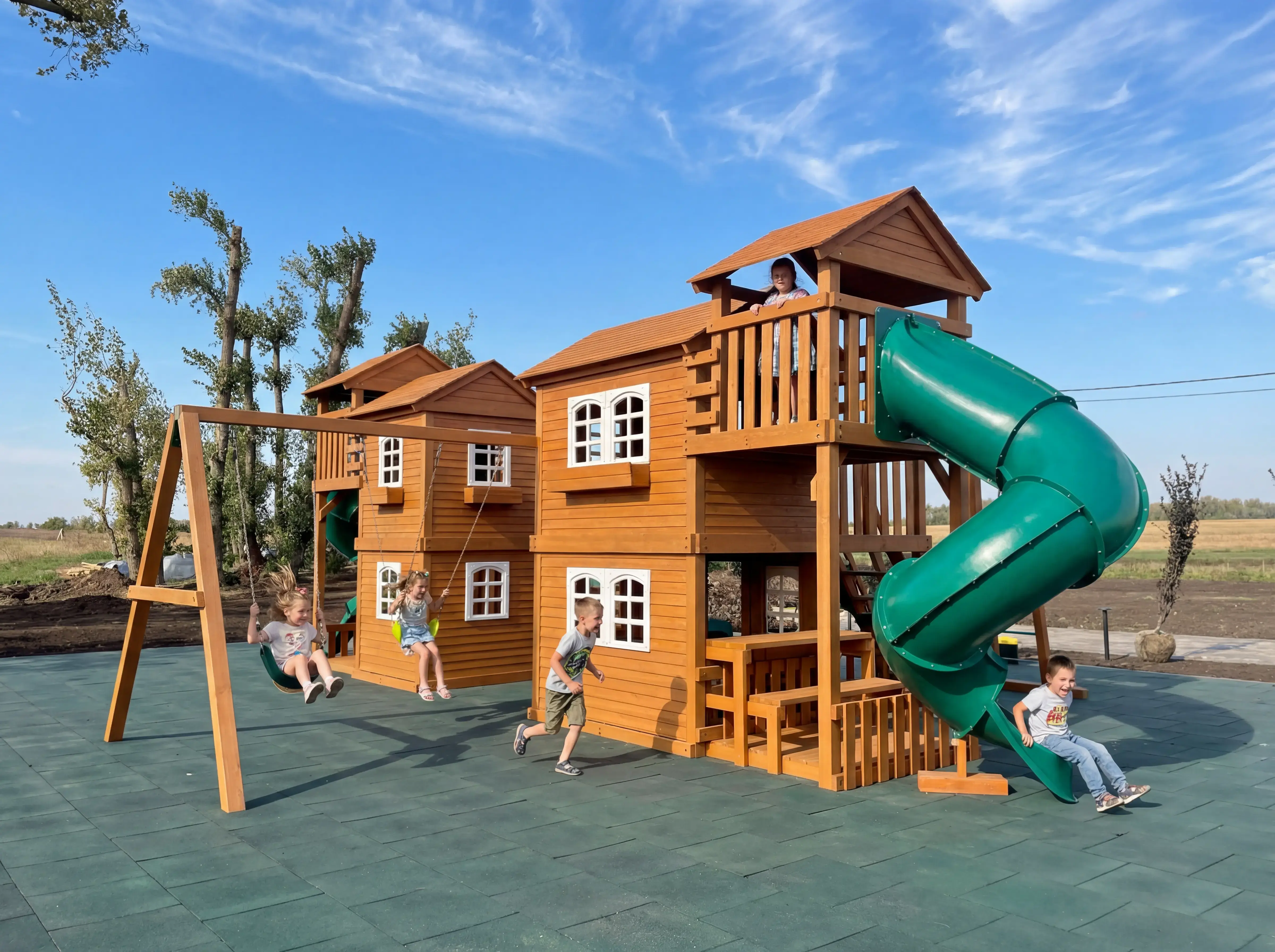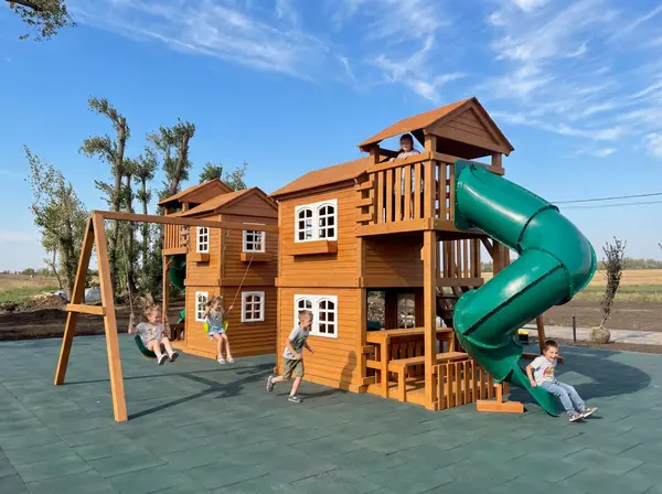 Детская площадка Домик 7 - это целый игровой город для детей от 3 до 12 лет. Главная особенность комплекса - это несколько домиков, соединенных между собой переходами-мостиками, которые создают простор для самых разных игр. В этой площадке есть все для активного отдыха и развития: три волновые горки разной длины и две горки-трубы, качельный модуль с одиночными и кубельковыми качелями для самых маленьких. Для юных скалолазов предусмотрен большой скалодром с канатом, рукоход и несколько лестниц. Внутри домиков достаточно места для настольных игр и детских посиделок, а игра "Крестики-нолики" поможет развить логическое мышление. Площадка изготовлена из клееного бруса 100х100 мм, что обеспечивает надежность и долговечность конструкции. Все деревянные элементы обработаны нетоксичной пропиткой на водной основе, безопасной для детей. Крепежные элементы оцинкованы и утоплены в дерево, что исключает травмы. Комплекс соответствует стандартам ГОСТ, гарантируя безопасность ваших детей. Доставка осуществляется по всей России, до терминала транспортной компании в вашем городе бесплатно. Вы можете собрать площадку самостоятельно за 1-2 дня, используя подробную инструкцию, или воспользоваться услугами наших опытных сборщиков.