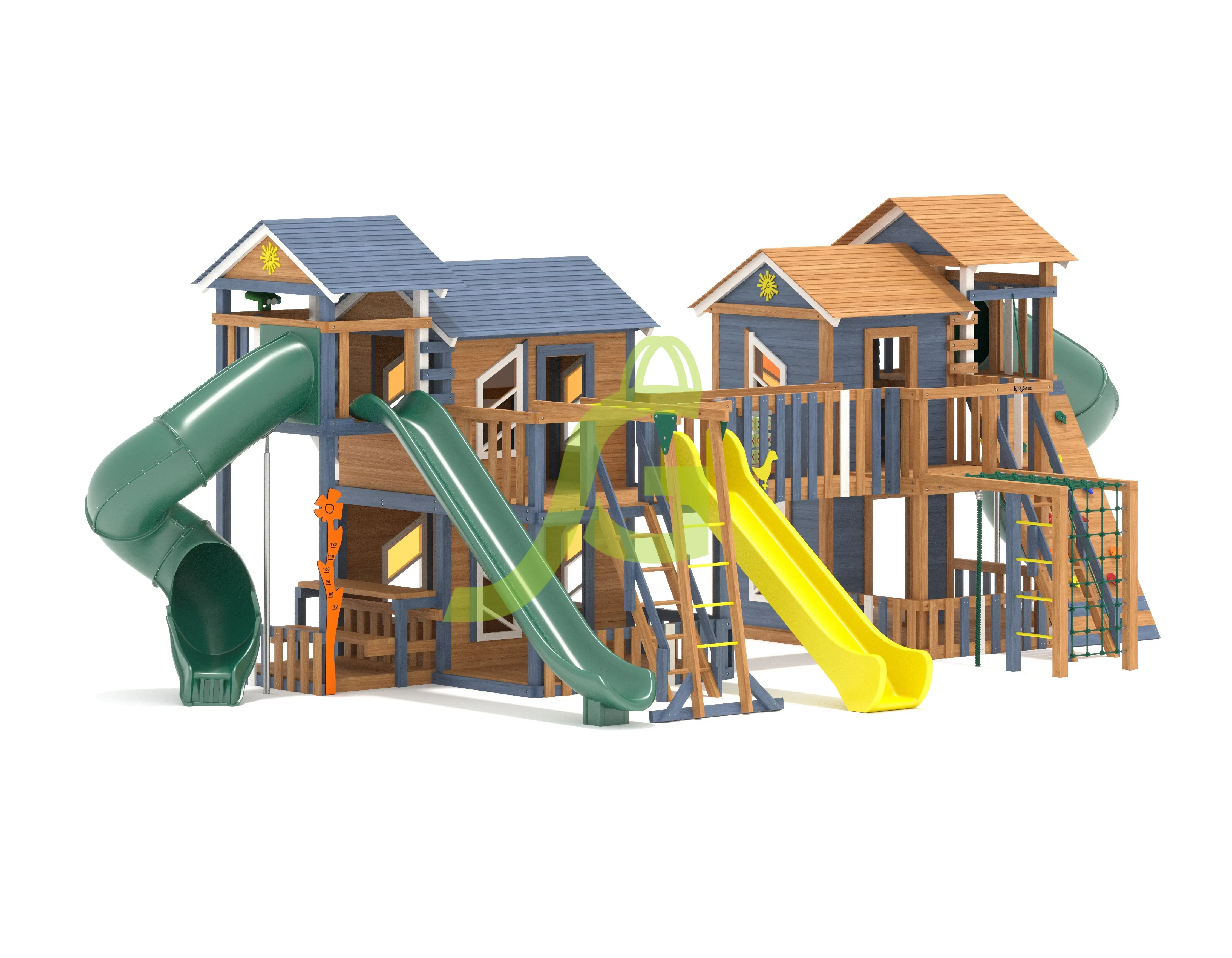 Детская площадка Шато Сан (мод.1) - это большой деревянный комплекс для детей в возрасте от 3 до 12 лет, который подходит для установки в общественных местах.