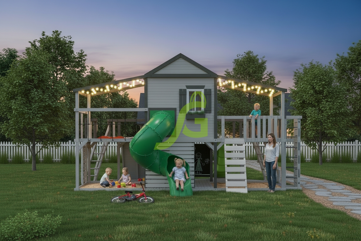 В комплект Домик D1 мод.2 входит: длина: 7,1 м, ширина: 7 м, высота: 3,9 м. Все элементы обработаны защитным покрытием, безопасным для детей. Сертификация по ГОСТ.