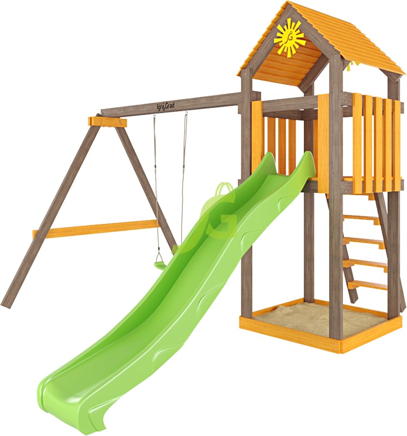 Площадка Игруня 1 - это компактный игровой комплекс для детей от 3 до 7 лет. Она идеально подходит для дачи или небольшого двора, предлагая набор активностей в одном месте. Главная фишка - продуманная конструкция, которая позволяет детям играть вместе, не мешая друг другу. Комплекс включает двухуровневую башню с деревянной крышей, защищающей от солнца и небольшого дождя. На верхний уровень ведет удобная деревянная лестница с широкими ступенями. Оттуда можно скатиться по волновой горке длиной 2,2 метра, которая подходит для катания круглый год. Внизу расположена просторная песочница для самых маленьких, а также качельный модуль с одним пластиковым сиденьем. Площадка изготовлена из клееного бруса северных хвойных пород, что гарантирует прочность и долговечность. Все деревянные элементы тщательно отшлифованы, чтобы исключить занозы, а крепежные элементы утоплены в дерево, предотвращая зацепки. Древесина обработана безопасной пропиткой на водной основе, которая защищает ее от внешних воздействий и подчеркивает естественную текстуру. Конструкция соответствует стандартам ГОСТ, обеспечивая безопасность во время игр. Мы доставляем площадки по всей России. Доставка до терминала транспортной компании в вашем городе бесплатна. Собрать площадку можно самостоятельно за 1-2 дня, следуя подробной инструкции. Если вы предпочитаете профессиональную установку, наши опытные мастера готовы помочь со сборкой на вашем участке.