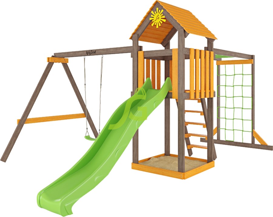Детская площадка Игруня 3 - это полноценный игровой комплекс для детей от 3 до 12 лет, который станет центром притяжения для самых активных ребят. Ее главная особенность - двухуровневый домик с крышей, который открывает простор для ролевых игр и приключений. Площадка оборудована разнообразными элементами для физического развития и развлечений. Здесь есть волновая горка длиной 2,2 метра, где дети смогут быстро спускаться, испытывая радость движения. Качельный модуль с одной пластиковой качелью позволит покататься с ветерком. Для любителей полазать предусмотрены рукоход и сетка-лазалка, а также классическая деревянная лестница. Внизу башни расположена просторная песочница, где малыши смогут строить свои замки и лепить пасочки. При производстве Игруни 3 используются только качественные и безопасные материалы. Основные элементы выполнены из клееного бруса, который отличается прочностью и устойчивостью к внешним воздействиям. Древесина проходит двойную шлифовку и обрабатывается специальной пропиткой без токсичных компонентов, что защищает ее от влаги, ультрафиолета и перепадов температур. Все болтовые соединения утоплены в материал, а крепеж оцинкован, что исключает коррозию и обеспечивает надежность конструкции в соответствии с ГОСТ. Мы доставляем площадки по всей России, а до терминала транспортной компании в вашем городе - бесплатно. Вы можете собрать площадку самостоятельно, это займет 1-2 дня, или заказать услугу сборки у наших опытных мастеров. Подробная инструкция по сборке входит в комплект.