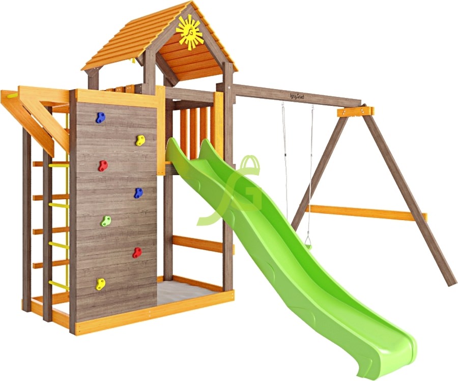 Детская площадка Игруня 5 - это компактный комплекс для детей от 3 до 10 лет, который станет центром игр на вашем участке. Ее главная особенность - продуманное сочетание активностей для разного возраста в ограниченном пространстве. На площадке есть все необходимое для увлекательного досуга. Двухуровневая башня с деревянной крышей надежно защищает от солнца и небольшого дождя. Спуститься вниз можно по волновой горке длиной 2,2 метра или по обычной деревянной лестнице. Для развития ловкости предусмотрены скалодром и веревочная лестница, а качельный модуль с одной пластиковой качелью подарит минуты радости. Под башней расположено место для песочницы. Площадка изготовлена из клееного бруса хвойных пород, который проходит специальную сушку и шлифовку. Все деревянные элементы обработаны безопасными составами на водной основе, увеличивающими срок службы и защищающими от внешних воздействий. Края деталей скруглены, а крепежные элементы утоплены для максимальной безопасности. Конструкция соответствует требованиям ГОСТ. Доставка площадки осуществляется по всей России до терминала транспортной компании в вашем городе бесплатно. Собрать комплекс можно самостоятельно за 1-2 дня, следуя подробной инструкции. Если вы предпочитаете доверить сборку профессионалам, наши мастера готовы выполнить эту работу.