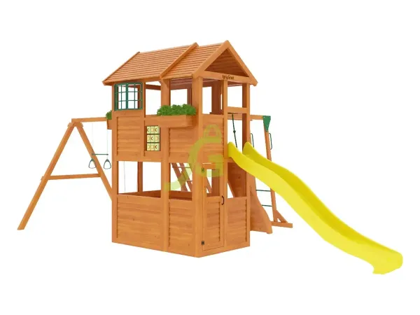 Люкс-версия. Волновая горка 3 м, деревянная дверь, фонарики на солнечных батарейках, пластиковые окошки и кашпо. Качельный модуль, скалодром и канат, лестница-скалодром. Вес 298 кг.