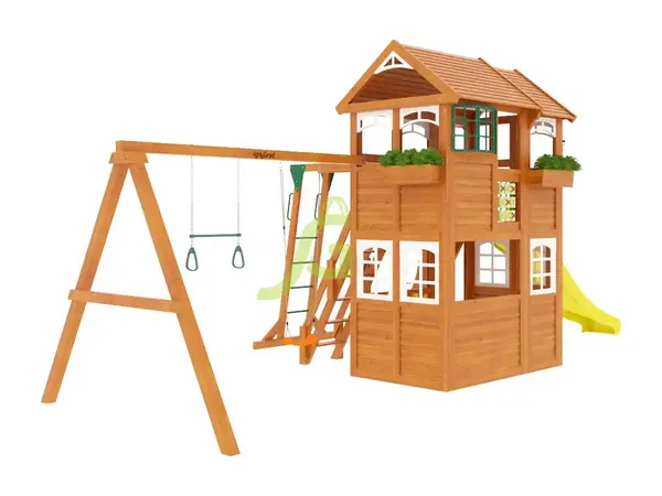 Детская площадка "Клубный домик 2 Люкс" - это компактный игровой комплекс для детей от 3 лет, который отлично подходит для дачи или небольшого загородного участка.