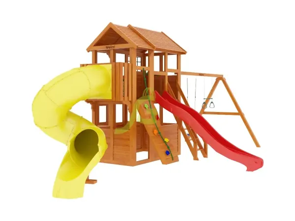 Люкс-версия. Волновая горка 3 м, деревянная дверь, фонарики на солнечных батарейках, пластиковые окошки и кашпо. Качельный модуль, скалодром и канат, лестница-скалодром. Вес 298 кг.