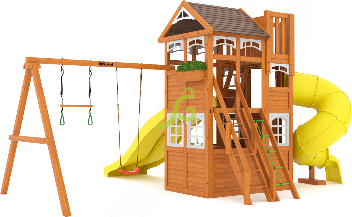 Детская площадка Клубный домик 4 Люкс с двумя горками - это большой игровой комплекс для детей от 3 до 12 лет. Главная особенность этой площадки - наличие сразу двух волновых горок и одной горки-трубы, что позволит нескольким детям одновременно наслаждаться спуском. Это отличный выбор для активных игр на свежем воздухе. Площадка включает двухуровневый игровой домик с дверью и деревянной крышей, а также дополнительную трехуровневую башню со смотровой площадкой. Здесь есть две волновые горки длиной 3 метра каждая и одна горка-труба с высоты 1,5 метра. Для подъема предусмотрены деревянная лестница с перилами и скалодром с канатом. Качельный модуль оборудован пластиковыми одиночными качелями и трапецией с кольцами. Дополнительные элементы - деревянное кашпо, доска для игры в "Крестики-нолики" и пластиковые окошки. Все элементы площадки выполнены из клееного бруса, который обработан безопасными пропитками, защищающими дерево от влаги и вредителей. Крепежные элементы оцинкованы, что предотвращает их коррозию. Конструкция соответствует требованиям ГОСТ, обеспечивая безопасность во время игр. Высота площадки составляет 3,38 м, ширина - 3,75 м, длина - 6,51 м. Мы доставляем площадки по всей России. Доставка до терминала транспортной компании в вашем городе бесплатна. Собрать площадку можно самостоятельно за 1-2 дня, следуя подробной инструкции, или заказать услугу профессиональной сборки у наших мастеров.