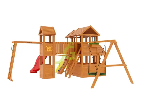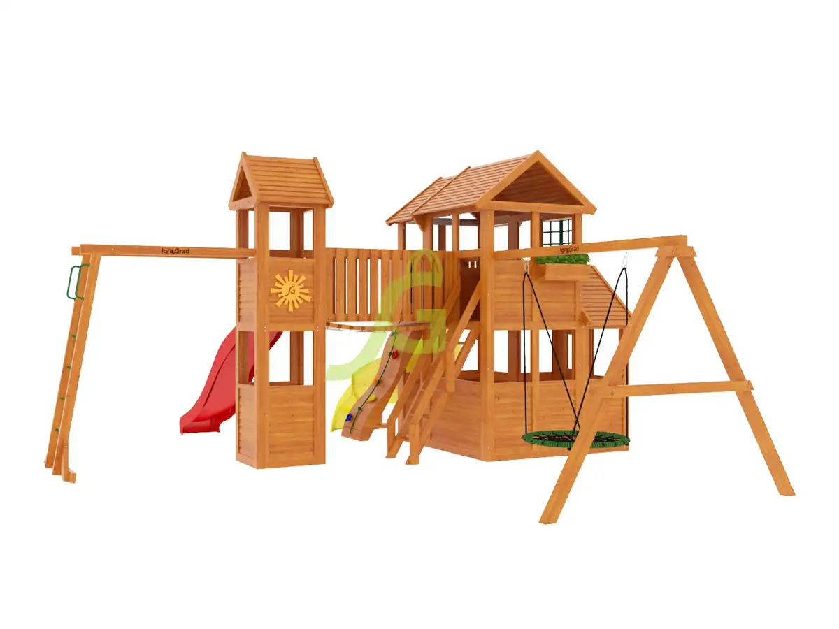 Детская площадка "Клубный домик Макси с трубой" - это целый игровой комплекс для детей от 3 до 12 лет, который станет центром притяжения на вашем участке. Ее главная особенность - два домика, соединенные подвесным мостом, и две горки: классическая и необычная горка-труба. В этом комплексе есть все для активных игр и развития. Дети смогут кататься с трехметровой волновой горки или спускаться по горке-трубе высотой 1,5 метра. Для любителей полазать предусмотрены скалодром, деревянная лестница и канат. Подвесной мостик соединяет два домика, добавляя элемент приключения. На качельном модуле установлены качели-гнездо диаметром 100 см, где можно отдохнуть после активных занятий. А доска для игры в "Крестики-нолики" позволит провести время с пользой и развивать логическое мышление. Площадка изготовлена из клеенного бруса - это прочный и долговечный материал, устойчивый к деформации. Все деревянные элементы обработаны безопасной пропиткой, которая защищает древесину от влаги, грибка и насекомых, продлевая срок службы конструкции. Крепежные элементы выполнены из оцинкованной стали, что предотвращает коррозию. Комплекс соответствует требованиям ГОСТ, что гарантирует безопасность и надежность использования. Мы доставляем площадки по всей России, а до терминала транспортной компании в вашем городе доставляем бесплатно. Площадка поставляется в разобранном виде, но благодаря подробной инструкции вы сможете собрать ее самостоятельно за 1-2 дня. Если вы предпочитаете доверить сборку профессионалам, наши мастера готовы выполнить эту работу качественно и быстро.