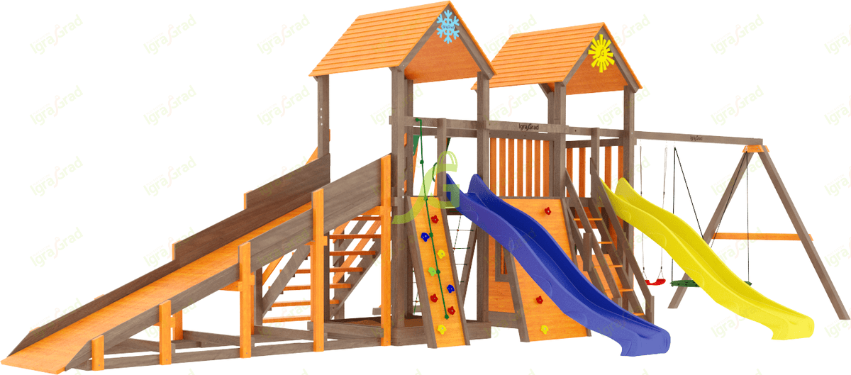 Детская площадка Комбо - это настоящий игровой город для детей от 3 до 12 лет. Она объединяет множество активностей, позволяя вашим детям играть вместе, развивая ловкость и воображение. Главная особенность этой площадки - две башни, соединенные мостиком, которые создают пространство для самых разных приключений. На площадке Комбо есть все, что нужно для активного отдыха: две пластиковые горки длиной 3 метра и одна зимняя горка длиной 4 метра для веселых спусков, а также два скалодрома с камнями, чтобы дети могли тренировать силу и координацию. Качельный модуль включает одиночные качели и качели-гнездо, где можно покачаться вдвоем или втроем. Рукоход и веревочная сетка для лазания помогут развить верхний плечевой пояс, а деревянные лестницы с перилами обеспечат удобный доступ ко всем уровням. Площадка изготовлена из клееного бруса - прочного и долговечного материала, который не деформируется со временем. Все деревянные элементы обработаны антисептической пропиткой, защищающей от влаги, грибка и насекомых, а также придающей им приятный цвет. Крепеж выполнен из оцинкованной стали, что гарантирует надежность и безопасность конструкции. Все элементы соответствуют требованиям ГОСТ, что подтверждает высокое качество и безопасность продукции для ваших детей. Мы доставляем площадки по всей России. Доставка до терминала транспортной компании в вашем городе бесплатна. Вы можете собрать площадку самостоятельно за 1-2 дня, следуя подробной инструкции, или воспользоваться услугами наших опытных мастеров. Они быстро и качественно установят площадку на вашем участке.