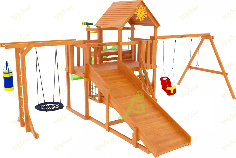 Детская площадка Крафт Про 4 с зимней горкой - это многофункциональный игровой комплекс для детей от 3 до 12 лет. Она предлагает разнообразные активности и станет центром притяжения для юных исследователей, даря им массу впечатлений круглый год. На площадке есть двухуровневая башня с деревянной крышей, куда ведут скалодром, веревочная сетка и деревянные лестницы с перилами. Спуститься можно по волновой горке или по зимнему модулю Snow Fox. В комплексе предусмотрены качельный модуль с качелями-гнездом "паутинка" и пластиковыми кубельковыми качелями, рукоход, турник, гимнастические кольца, канат, боксерская груша с перчатками и баскетбольное кольцо. Для спокойного отдыха есть столик-лавочка. Конструкция выполнена из клееного бруса камерной сушки сечением 70х70 мм, что обеспечивает надежность и устойчивость. Древесина обработана нетоксичной пропиткой на водной основе, защищающей от гниения, рассыхания и перепадов температур. Все крепежные элементы оцинкованы и не подвержены ржавчине. Игровой комплекс соответствует стандартам безопасности ГОСТ. Мы доставляем площадки по всей России, бесплатно довозим до терминала транспортной компании в вашем городе. Вы можете собрать площадку самостоятельно за 1-2 дня, используя подробное руководство, или заказать услугу профессиональной сборки у наших мастеров.