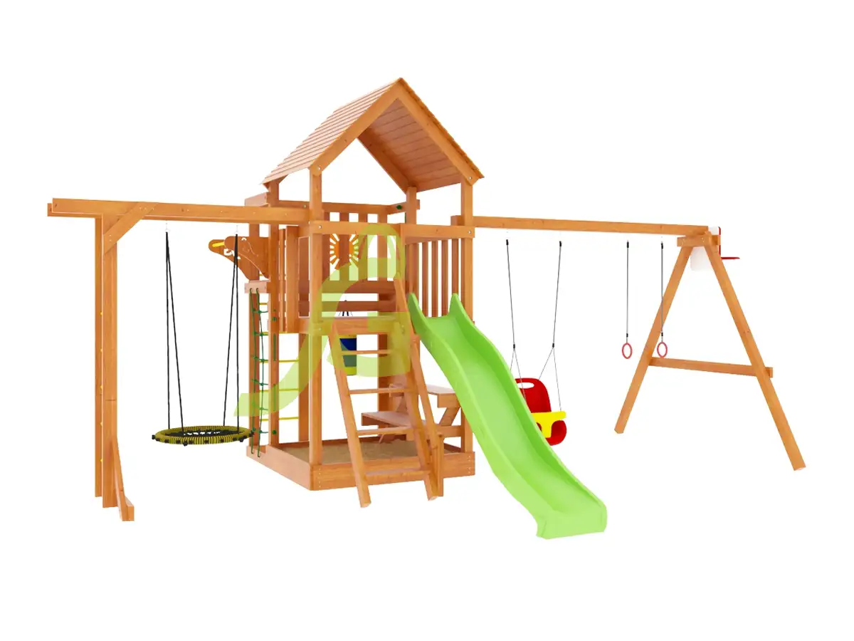 Детская площадка Крафт Про 4 со скатом 2,2 метра - это комплекс для активных игр и занятий спортом, который подходит детям от 3 до 12 лет. Главная особенность этой модели - двухуровневая башня, которая станет центром всех приключений. Площадка предлагает множество активностей: волновую горку для веселых спусков, две качели (одна из которых - качели-гнездо "паутинка" для комфортного отдыха), рукоход, скалодром, турник и сетку для восхождения. Также есть боксерская груша с перчатками и баскетбольное кольцо для тренировки меткости. Под одной из платформ можно организовать песочницу, а столик с лавочкой позволит детям отдохнуть и перекусить. Конструкция площадки выполнена из клееного бруса сечением 70х70 мм, что обеспечивает ей прочность и долговечность. Все деревянные элементы обработаны специальной нетоксичной пропиткой, которая защищает их от гниения и возгорания. Крепежные элементы оцинкованы и утоплены в дерево, что исключает появление острых углов и шероховатостей. Площадка полностью соответствует государственным стандартам безопасности. Мы доставляем площадки по всей России до терминала транспортной компании бесплатно. Собрать комплекс вы сможете самостоятельно за 1-2 дня, используя подробную инструкцию. Если вы предпочитаете профессиональную установку, наши мастера готовы выполнить сборку на вашем участке.