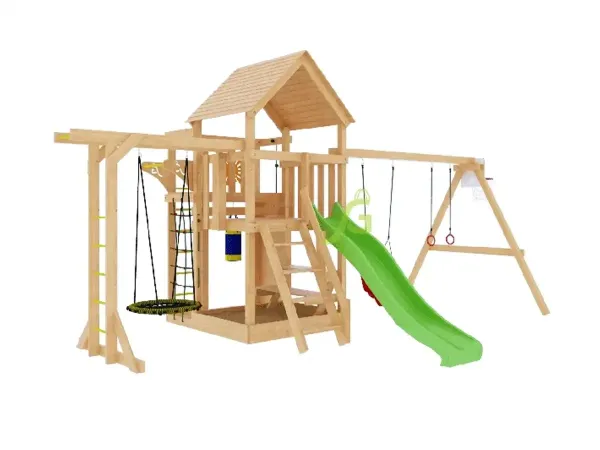 Неокрашенная площадка быстрой сборки. Деревянная крыша, качельный модуль, волновая горка 2.2 м. Подберите аксессуары и цвет вместе с ребенком. Вес 176 кг.