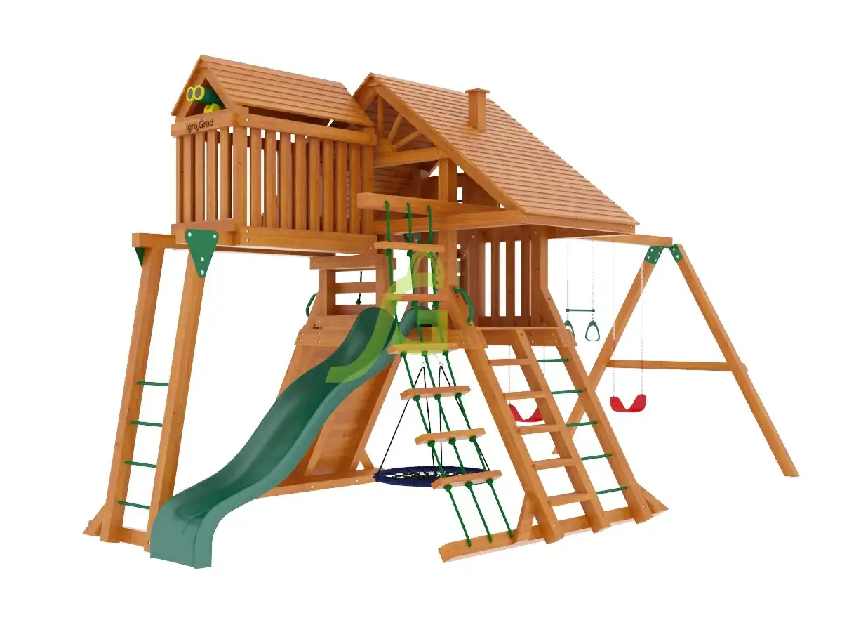 Детская площадка Крепость Фани Делюкс - это большой игровой комплекс для детей от 3 до 12 лет, который станет центром притяжения на вашем участке. Главная особенность этой площадки - двухуровневый домик с деревянной крышей и множеством развивающих элементов. На площадке Крепость Фани Делюкс есть все для активных игр: волновая горка высотой 1,5 метра, скалодром с цветными камнями, веревочная лестница и комбинированная деревянно-металлическая лестница. Для развития ловкости предусмотрен рукоход с дополнительным домиком. Качельный модуль включает две гибкие качели на цепях в резиновой оболочке, трапецию с кольцами и качели-гнездо "паутинка". Разнообразить досуг помогут доска для игры в "Крестики-нолики", бинокль и руль. Площадка изготовлена из клееного бруса - это прочный и долговечный материал, который не деформируется со временем. Все деревянные элементы обработаны безопасной пропиткой, защищающей от влаги, грибка и насекомых. Для креплений используется оцинкованный крепеж, устойчивый к коррозии. Конструкция соответствует требованиям ГОСТ Р 52169-2012 по безопасности детских игровых площадок. Мы доставляем площадки по всей России. Доставка до терминала транспортной компании в вашем городе бесплатна. Собрать комплекс вы сможете самостоятельно за 1-2 дня, используя подробную инструкцию, или воспользоваться услугами наших опытных мастеров.