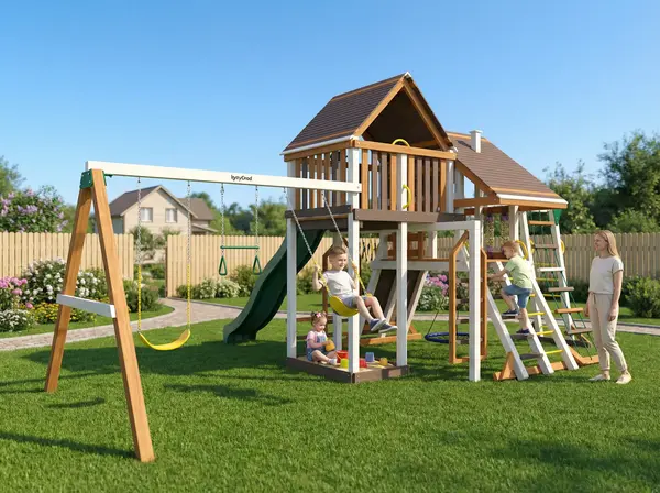 Детская площадка Шато Сан мод.1 - это масштабный игровой комплекс для детей от 3 до 12 лет, который станет центром притяжения на вашем загородном участке.