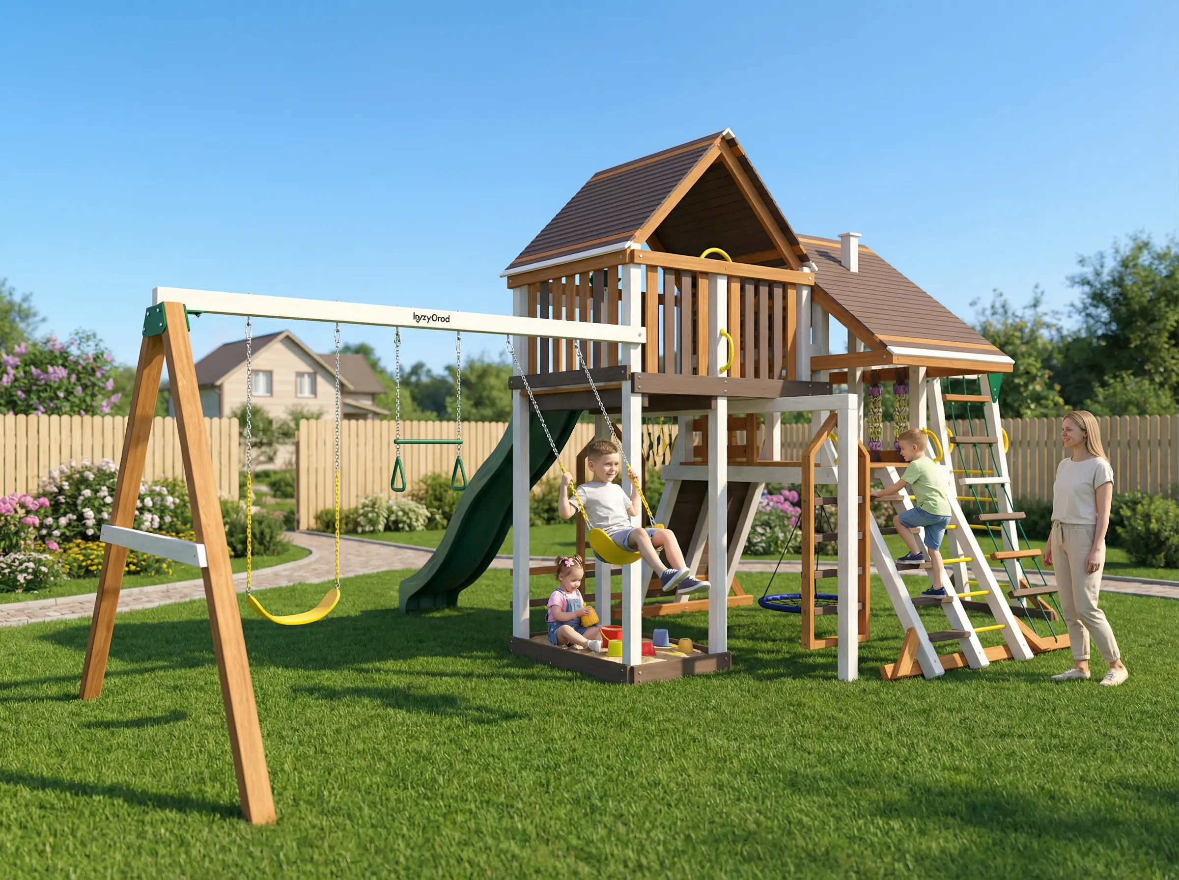 Детская площадка Крепость Фани Делюкс + мод.2 - это большой игровой комплекс для детей от 3 до 12 лет, который станет центром притяжения на вашем участке. Главная особенность этой модели - многоуровневая конструкция, предлагающая множество вариантов для активных игр и развития. На этой площадке ваш ребенок найдет все, что нужно для увлекательного досуга. Здесь есть двухуровневый домик с деревянной крышей и дополнительный открытый домик с бортиками. Для спуска предусмотрена волновая горка длиной 4 метра. Подниматься можно по двойной широкой лестнице (деревянная и металлическая) или по веревочной лестнице. В комплекте также качельный модуль с качелями-гнездом, двумя гибкими качелями на цепях и трапецией с кольцами. Для развития ловкости есть широкий скалодром, канат, большой и малый рукоходы, а также игровой набор "ниндзя". Дополняют комплекс песочница, доска "крестики-нолики", меловая доска, бинокль и штурвал. Комплекс изготовлен из клееного бруса 100х100 мм, что обеспечивает прочность и долговечность конструкции. Все деревянные элементы обработаны нетоксичными пропитками, которые защищают древесину от внешних воздействий и продлевают срок службы площадки. Крепежные элементы оцинкованы, что предотвращает коррозию. Площадка соответствует стандартам безопасности ГОСТ, а для дополнительной устойчивости предусмотрены крепежные элементы "якорь". Мы доставляем площадки по всей России. Доставка до терминала транспортной компании в вашем городе осуществляется бесплатно. Собрать комплекс вы можете самостоятельно, используя подробное руководство, это займет 1-2 дня. Если вы предпочитаете профессиональный подход, наши мастера готовы выполнить сборку.
