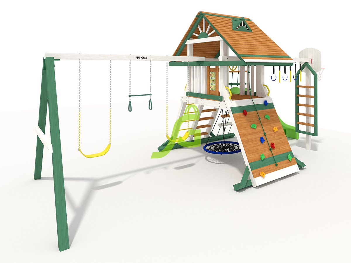 Детская площадка Крепость Фани мод.1 - это масштабный игровой комплекс для детей от 3 до 12 лет, который превратит ваш двор в настоящий приключенческий городок. Ее главная особенность - двухуровневый домик с массой активностей, который станет центром всех игр. Площадка имеет размеры 6,52 м в длину, 3,5 м в ширину и 3 м в высоту. В состав площадки входит двухуровневый домик с деревянной крышей и даже декоративной дымовой трубой. С него можно скатиться по волновой горке длиной 3 метра с высоты 1,5 метра. Для подъема предусмотрены двойная широкая лестница (деревянная и металлическая) и веревочная лестница-штормтрап. Качельный модуль включает качели-гнездо, две гибкие качели на цепях в резиновой оболочке и трапецию с кольцами. Для любителей спортивных игр есть баскетбольный щит, широкий скалодром, канат и рукоход. Дополнительные развлечения - игровой набор "ниндзя", доска "крестики-нолики", бинокль и штурвал, которые помогут развить фантазию и координацию. Площадка Крепость Фани изготовлена из клееного бруса сечением 100х100 мм, что обеспечивает ее прочность и долговечность. Все деревянные элементы обработаны безопасными пропитками, которые защищают дерево от влаги, ультрафиолета и вредителей. Для крепления используются оцинкованные метизы, устойчивые к коррозии. Конструкция соответствует требованиям ГОСТ, а ее безопасность подтверждена наличием двух крепежных элементов-якорей для надежной фиксации в грунте. Мы доставляем площадки по всей России. Доставка до терминала транспортной компании в вашем городе осуществляется бесплатно. Вы можете собрать комплекс самостоятельно за 1-2 дня, используя подробное руководство и комплект фурнитуры. Если вы предпочитаете профессиональную сборку, наши мастера выполнят эту работу, при этом стоимость услуги составит 15% от цены комплекса.