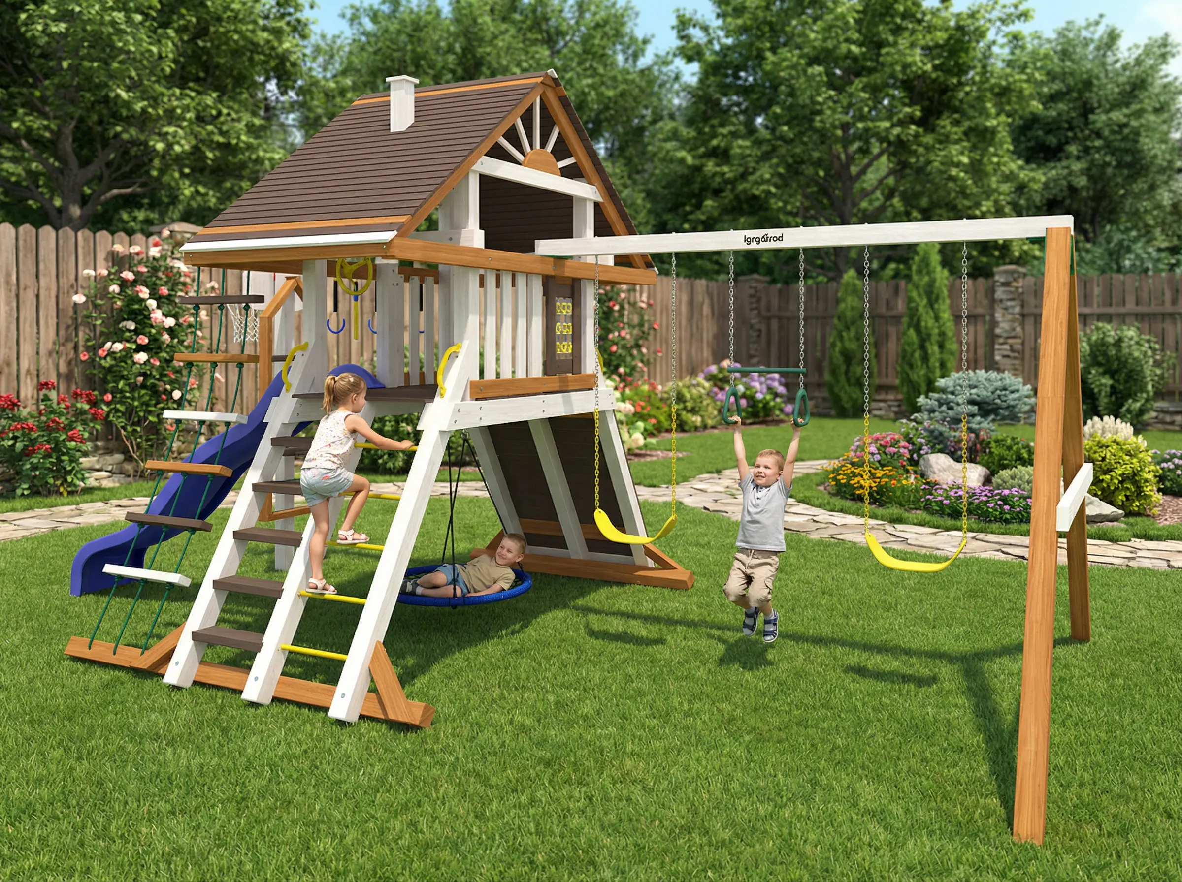 Детская площадка Шато Сан мод.1 - это масштабный игровой комплекс для детей от 3 до 12 лет, который станет центром притяжения на вашем загородном участке.
