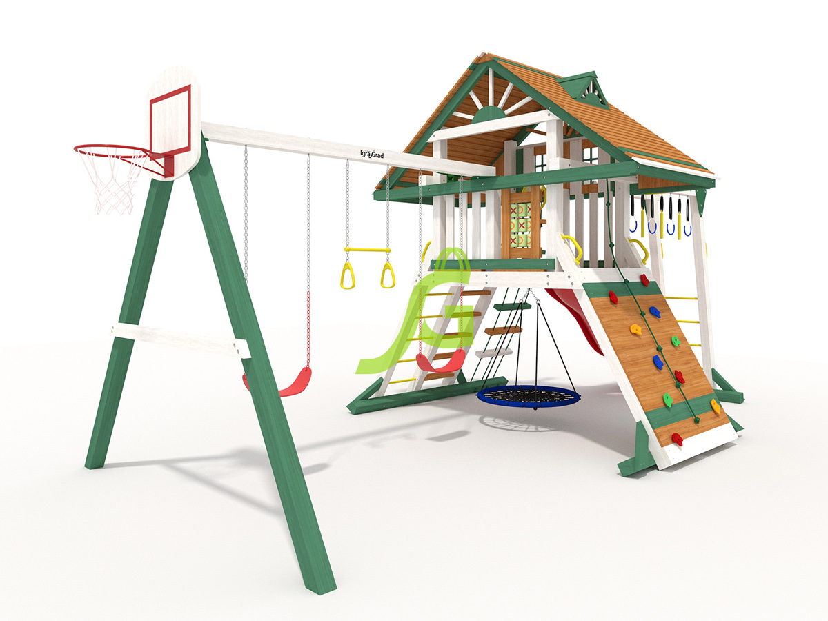 Детская площадка Крепость Фани с рукоходом (Домик) мод.1 - это целый игровой комплекс для детей от 3 до 12 лет. Главная особенность этой модели - двухуровневый домик с деревянной крышей и дополнительной стенкой с пластиковыми окошками, который станет центром всех приключений. Площадка предлагает множество активностей: волновая горка длиной 3 метра, качельный модуль с качелями-гнездом, гибкими качелями на цепях и трапецией с кольцами. Для развития ловкости есть широкий скалодром, канат, веревочная лестница и большой с малым рукоходами. Дополнительно предусмотрены баскетбольный щит, доска "крестики-нолики", бинокль и штурвал, чтобы каждый ребенок нашел занятие по душе. Основа конструкции - клееный брус сечением 100х100 мм, что обеспечивает надежность и долговечность. Все элементы обработаны безопасными пропитками, защищающими дерево от влаги и вредителей. Крепежные элементы оцинкованы, что предотвращает коррозию. Площадка разработана с учетом требований ГОСТ, поэтому вы можете быть уверены в ее безопасности. Мы доставляем площадки по всей России, до терминала транспортной компании в вашем городе бесплатно. Сборка не вызовет сложностей: подробная инструкция позволит вам собрать комплекс за 1-2 дня. Если вы предпочитаете доверить это дело профессионалам, наши мастера готовы выполнить сборку на вашем участке.