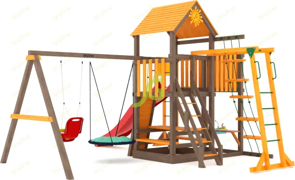 Деревянная крыша, веревочная лестница, канат с тремя узлами, веревочная сетка для лазания. Кубельковые качели и лодочка, волновая горка 3 м, скалодром с канатом и песочница. Вес 200 кг.