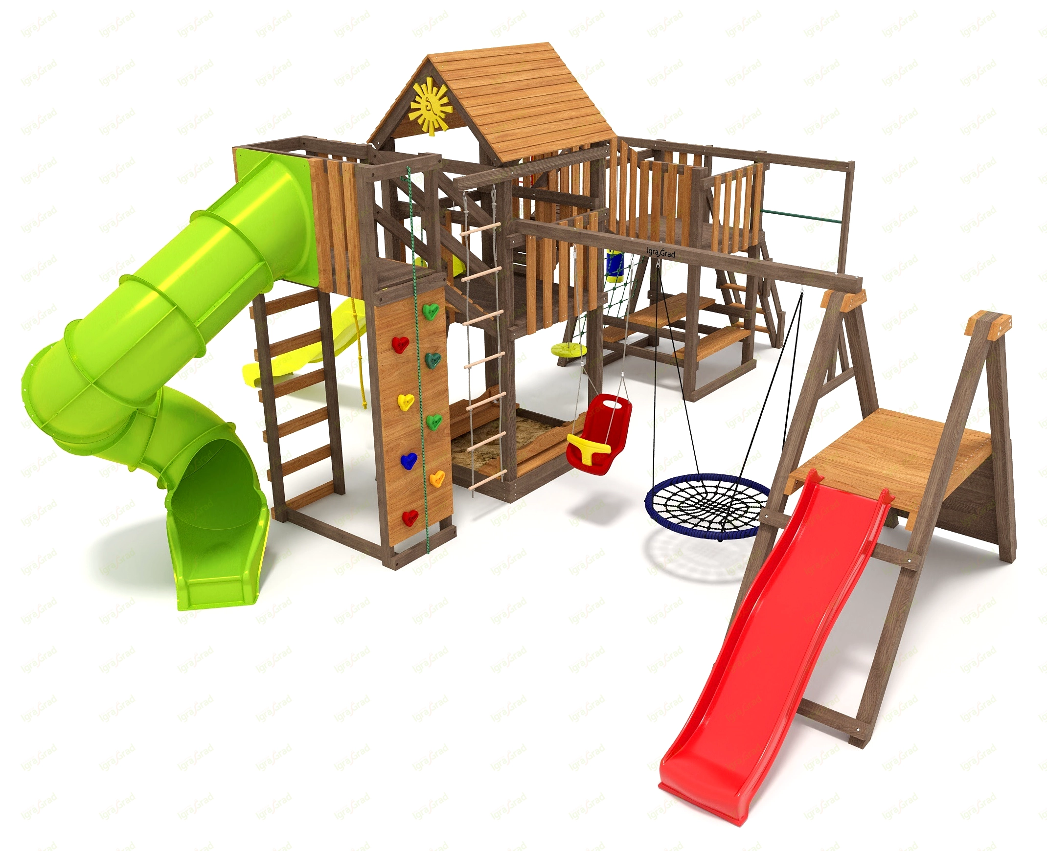 Детская площадка Панда Фани Мостик 2 с трубой 2,1м - это целый игровой комплекс для детей от 3 до 12 лет, который станет центром притяжения на вашем участке. Главная особенность этой площадки - две башни, соединенные мостиком, создающие пространство для активных игр и приключений. На этой площадке вашим детям будет чем заняться. Здесь есть две волновые горки разной длины и горка-труба, скалодром с разноцветными камнями, веревочная лестница, канат и сетка для лазания. Качельный модуль включает качели-гнездо и качели-люльку, а для спортивных игр предусмотрены баскетбольное кольцо и боксерская груша. На первом этаже расположена песочница с крышкой-трансформером, которая превращается в лавочки, а также столик с лавочками для отдыха и настольных игр. Площадка изготовлена из клееного бруса 90х90 мм, что обеспечивает прочность и долговечность конструкции. Все деревянные элементы тщательно отшлифованы, а пропитка на водной основе защищает древесину от внешних воздействий и безопасна для детей. Металлические элементы оцинкованы, а крепеж утоплен в дерево, чтобы исключить травмы. Площадка соответствует стандартам ГОСТ, что подтверждает ее надежность и безопасность. Мы доставляем площадки по всей России до терминала транспортной компании бесплатно. Вы можете собрать площадку самостоятельно за 1-2 дня, следуя подробной инструкции, или воспользоваться услугами наших профессиональных сборщиков. Якоря в комплект не входят и приобретаются отдельно, если вы планируете дополнительно закрепить конструкцию.