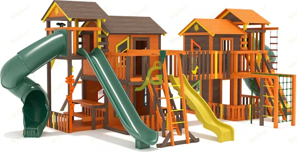 Двухуровневый домик со стенками и пластиковыми окошками. Деревянная крыша. Качельный модуль с двумя гибкими качелями, трапеция с кольцами. Волновая горка 3 м, песочница, скалодром с канатом, столик-лавочка и штормтрап.