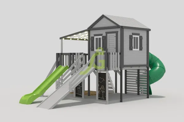 В комплект Домик 3 мод.1 входит: деревянные крыши, второй этаж, широкий скалодром, качельный модуль, двое качелей, горка 3 м, крестики-нолики. Все элементы обработаны защитным покрытием, безопасным для детей. Сертификация по ГОСТ.