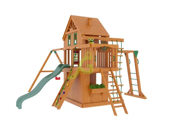 В комплект Шато 2 входит: закрытый домик, качельный модуль, кашпо, балкон с биноклем, скалодром, волновая горка, крестики-нолики. Все элементы обработаны защитным покрытием, безопасным для детей. Сертификация по ГОСТ.