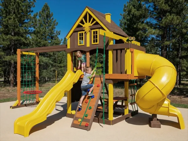 Яркая трехцветная окраска. Двухэтажный домик с деревянной крышей и трубой. Качельный модуль с гибкими качелями, трапеция с кольцами. Горка 3 м, песочница, скалодром с канатом. Балкон с биноклем и штурвалом.