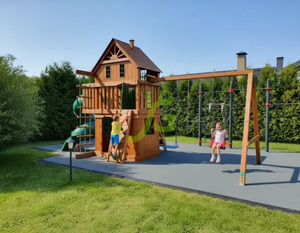 Двухуровневый домик с дополнительной башней. Гнездо, крестики-нолики, песочница. Качельный модуль. Подъемный трап и большой скат.