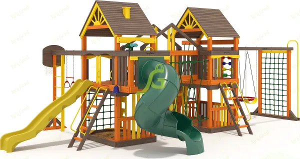 Двухуровневый домик со стенками и пластиковыми окошками. Деревянная крыша. Качельный модуль с двумя гибкими качелями, трапеция с кольцами. Волновая горка 3 м, песочница, скалодром с канатом, столик-лавочка и штормтрап.
