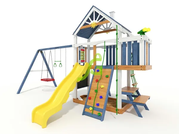 Двухуровневый домик со стенками и пластиковыми окошками. Деревянная крыша. Качельный модуль с двумя гибкими качелями, трапеция с кольцами. Волновая горка 3 м, песочница, скалодром с канатом, столик-лавочка и штормтрап.