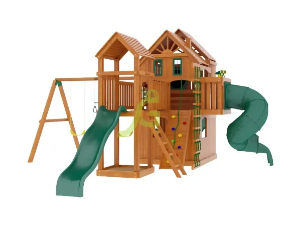 Двухуровневый домик со стенками и пластиковыми окошками. Деревянная крыша. Качельный модуль с двумя гибкими качелями, трапеция с кольцами. Волновая горка 3 м, песочница, скалодром с канатом, столик-лавочка и штормтрап.