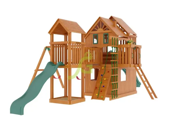 Двухуровневый домик со стенками и пластиковыми окошками. Деревянная крыша. Качельный модуль с двумя гибкими качелями, трапеция с кольцами. Волновая горка 3 м, песочница, скалодром с канатом, столик-лавочка и штормтрап.