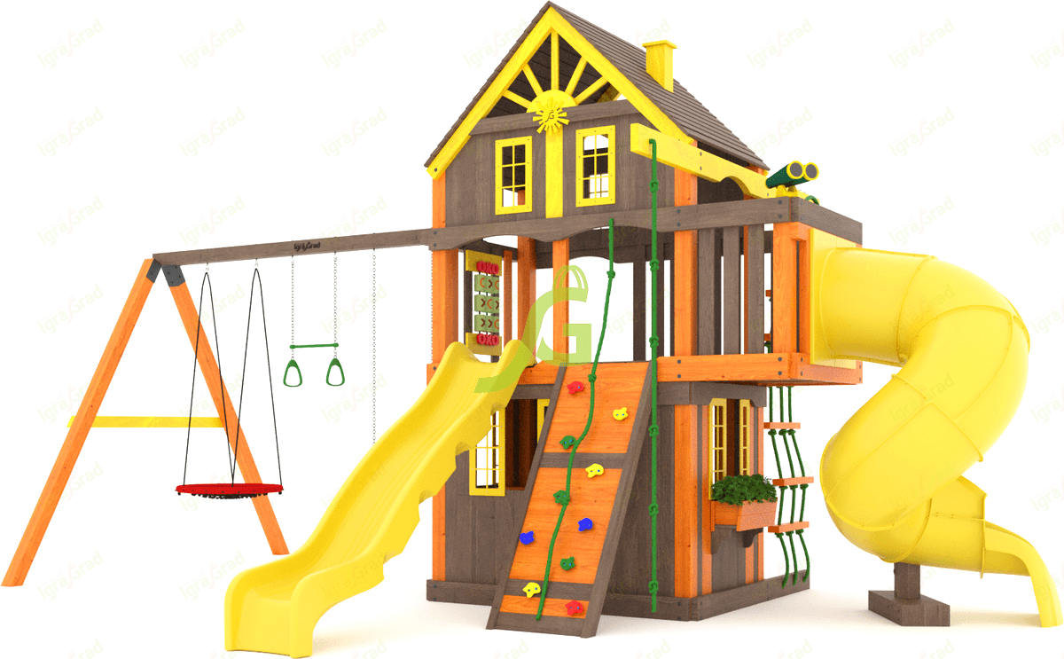 Детская площадка Шато 2 с трубой (Домик) мод.2 - это полноценный игровой комплекс для детей от 3 до 12 лет. Ее главная особенность - наличие сразу двух горок, включая увлекательную горку-трубу, что обязательно понравится активным малышам и подросткам. Эта площадка станет центром притяжения для детворы на вашем участке. Комплекс включает двухуровневый домик с красивыми пластиковыми окошками, зашитый снизу, что создает уютное пространство для игр. Здесь есть волновая горка и горка-труба с высоты 1,5 м. Для развития ловкости предусмотрены веревочная и деревянная лестницы, а также скалодром с камнями. Качельный модуль оборудован гибкими качелями на цепях в резиновой оболочке, качелями "Гнездо" диаметром 100 см и трапецией с кольцами. Дополнительные игровые элементы - доска для "Крестиков-ноликов", лавочка-столик, бинокль и руль - расширяют возможности для сюжетных игр. Площадка изготовлена из клееного бруса высокого качества, что обеспечивает прочность и долговечность конструкции. Все деревянные элементы обработаны безопасной пропиткой, защищающей от влаги и вредителей. Для сборки используется оцинкованный крепеж, устойчивый к коррозии. Конструкция соответствует требованиям ГОСТ, что гарантирует безопасность вашего ребенка во время игр. Мы доставляем площадки по всей России. До терминала транспортной компании в вашем городе доставка бесплатна. Вы можете собрать комплекс самостоятельно за 1-2 дня, следуя подробной инструкции, или воспользоваться услугами наших опытных мастеров по сборке.