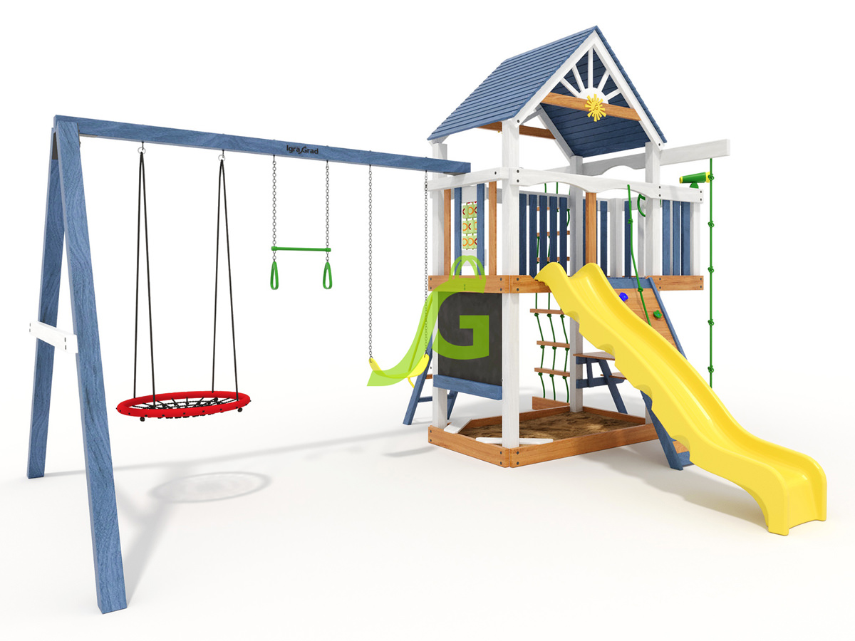 Детская площадка Шато мод.1 - это большой игровой комплекс для детей от 3 до 12 лет. Она предлагает множество активностей, которые надолго увлекут ребят, развивая их ловкость и воображение. Главная особенность - двухуровневый домик с разнообразными игровыми элементами. Площадка включает волновую горку, веревочную и деревянную лестницы для подъема, а также скалодром с камнями, который поможет развивать координацию. Качельный модуль оборудован гибкими качелями на цепях в резиновой оболочке и качелями-гнездом диаметром 100 см. Есть трапеция с кольцами, доска для игры в "Крестики-нолики", меловая доска и бинокль со штурвалом для приключений. Внизу расположена песочница и лавочка-столик, где дети смогут отдохнуть или перекусить. Конструкция площадки выполнена из клееного бруса, который обработан безопасными пропитками, защищающими дерево от влаги и вредителей. Все металлические элементы - оцинкованный крепеж, устойчивый к коррозии. Площадка соответствует государственным стандартам безопасности для детских игровых комплексов, что подтверждает ее надежность и долговечность. Мы доставляем площадки по всей России, до терминала транспортной компании в вашем городе бесплатно. Собрать комплекс можно самостоятельно за 1-2 дня, используя подробную инструкцию. Если вы предпочитаете профессиональную установку, наши мастера готовы выполнить сборку на вашем участке.
