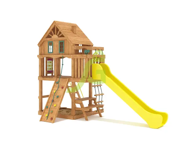 Игровая площадка Шато Домик - это двухуровневый игровой комплекс для детей от 3 до 12 лет, который отлично подойдет для общественных мест. Главная особенность - стилизация под настоящий домик с крышей, трубой и пластиковыми окошками. Ваши дети найдут здесь множество занятий. На первом этаже расположен столик со скамейкой для спокойных игр и общения. На второй уровень можно подняться по скалолазной стенке с разноцветными зацепами или по веревочной лестнице, развивая при этом координацию и силу. Спуститься обратно можно по горке или по обычной лесенке. Дополнительное развлечение - игра "Крестики-нолики", встроенная в ограждение второго этажа. Комплекс изготовлен из клееного бруса, который устойчив к деформациям и перепадам температур. Все деревянные детали обработаны безопасной пропиткой, защищающей от влаги, грибка и насекомых. Для сборки используется оцинкованный крепеж, устойчивый к коррозии. Площадка спроектирована с учетом требований безопасности и соответствует ГОСТ. Мы доставляем площадки по всей России, до терминала транспортной компании в вашем городе - бесплатно. Вы можете собрать комплекс самостоятельно за 1-2 дня, используя подробную инструкцию и необходимый крепеж, который входит в комплект. Если вам нужна помощь, наши мастера готовы выполнить сборку на вашем участке.