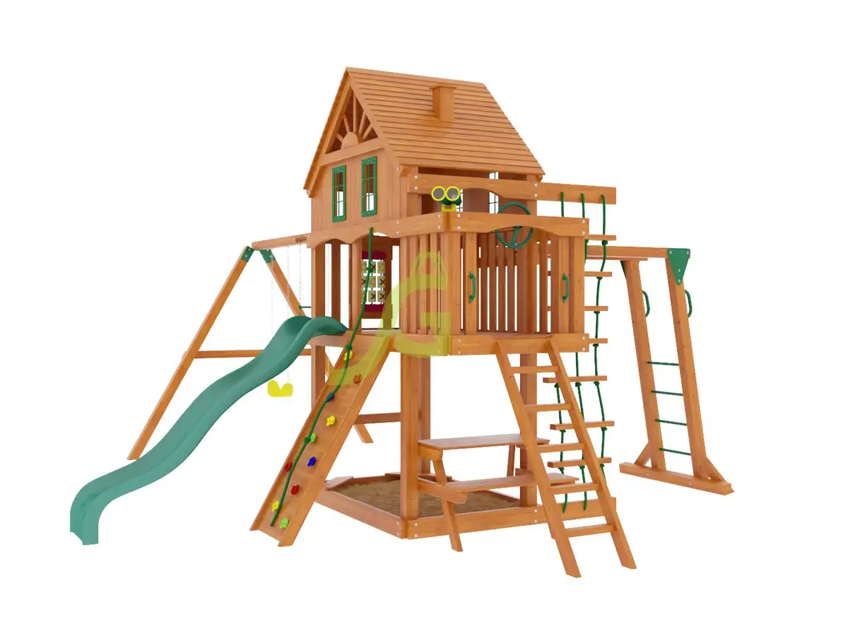 Шато с рукоходом (Домик) - деревянная детская площадка для детей 3-12 лет. Размеры 5,65 x 6,3 x 3,7 м. Качественный клееный брус, надежные крепления, иллюстрированная инструкция по сборке.