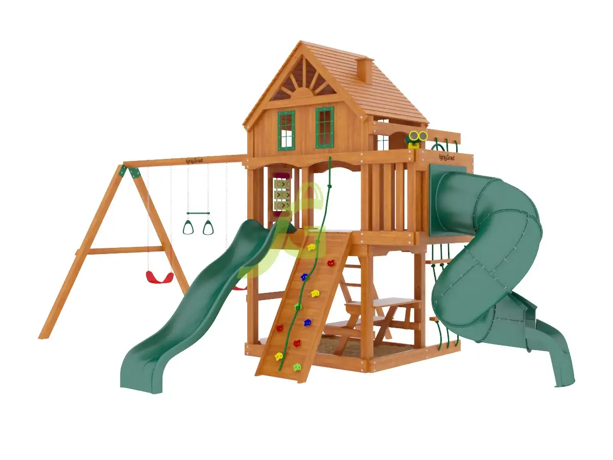 Детская площадка "Шато с трубой" - это двухуровневый игровой комплекс, который подарит вашим детям множество ярких впечатлений. Она подходит для детей от 3 до 10 лет и станет центром притяжения для активных игр на свежем воздухе. Главная особенность этой площадки - две разные горки, включая уникальную горку-трубу. Конструкция площадки включает в себя двухуровневый домик с окошками и крышей. Ваши дети смогут скатиться с волновой горки или спуститься по закрытой горке-трубе, высота которой 1,5 метра. Для любителей лазать предусмотрены скалодром с разноцветными камнями и канат, а также веревочная и деревянная лестницы. В комплексе есть качельный модуль с двумя гибкими качелями на цепях в резиновой оболочке и трапеция с кольцами. Внизу расположена песочница, а для развития логики - доска для игры в "Крестики-нолики". Все элементы площадки изготовлены из клееного бруса, обработанного безопасными пропитками, которые защищают дерево от внешних воздействий и продлевают срок службы. Крепеж выполнен из оцинкованной стали, что предотвращает коррозию и обеспечивает надежность конструкции. Площадка соответствует российским и европейским стандартам безопасности, таким как ГОСТ. Вы можете быть уверены в прочности и долговечности этой игровой зоны. Мы доставляем площадки по всей России. Доставка до терминала транспортной компании в вашем городе бесплатна. Вы можете собрать комплекс самостоятельно за 1-2 дня, следуя подробной инструкции, или воспользоваться услугами наших опытных мастеров по сборке. При заказе сборки, доставка до 50 км от МКАД осуществляется бесплатно.