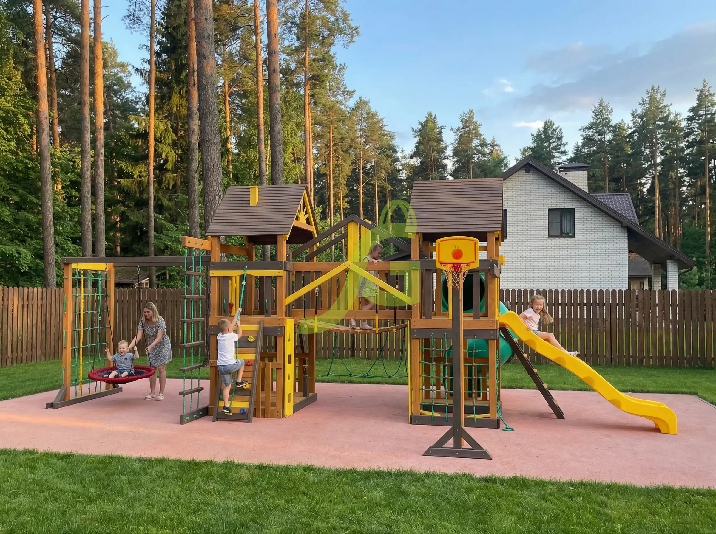 Детская площадка Шато Сан мод.2 - это целый игровой городок для детей от 3 до 12 лет. Она создана для активных игр на свежем воздухе и станет центром притяжения для вашего ребенка и его друзей. Главная особенность этой модели - два двухуровневых домика, соединенные веревочным мостиком, которые открывают простор для фантазии и ролевых игр. На площадке Шато Сан мод.2 есть множество элементов для развития ловкости и силы. Здесь установлены волновая горка и горка-труба с высоты 1,5 м, качели на цепях, качели-гнездо "паутинка", трапеция с кольцами и "обезьянья тропа". Для любителей полазать предусмотрены скалодром с камнями, веревочная и деревянные лестницы, а также сетки для лазания. Дополняют комплекс руль, бинокль, колокольчик, счеты, баскетбольный щит, доска для игры в "крестики-нолики" и песочница. Площадка изготовлена из клеенного бруса и массива сосны, прошедших шлифовку. Все деревянные детали обработаны специальной пропиткой, которая защищает древесину от воздействия влаги, грибка и насекомых, а также придает ей приятный оттенок. Крепежные элементы оцинкованы, что предотвращает их коррозию. Конструкция соответствует требованиям ГОСТ и прошла необходимую сертификацию, обеспечивая безопасность во время игр. Мы доставляем детские площадки по всей России. До терминала транспортной компании в Москве доставим бесплатно. Вы можете собрать площадку самостоятельно, следуя подробной инструкции - это займет 1-2 дня. Если вы предпочитаете доверить сборку профессионалам, наши опытные мастера выполнят монтаж быстро и качественно.