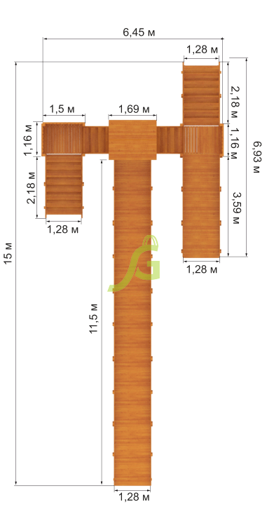 "Snow Fox 12 м" с двумя скатами (две лестницы) - деревянная детская площадка для детей 3-12 лет. Размеры 6,45 x 15,00 x 5,14 м. Качественный клееный брус, надежные крепления, иллюстрированная инструкция по сборке.