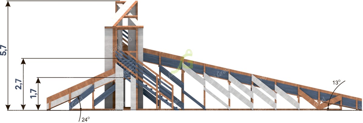 В комплект "Snow Fox 12 м" с двумя скатами мод.4 входит: длина: 16,37 м, ширина: 3,98 м, высота: 5,7 м, артикул: sf12-2411. Все элементы обработаны защитным покрытием, безопасным для детей. Сертификация по ГОСТ.